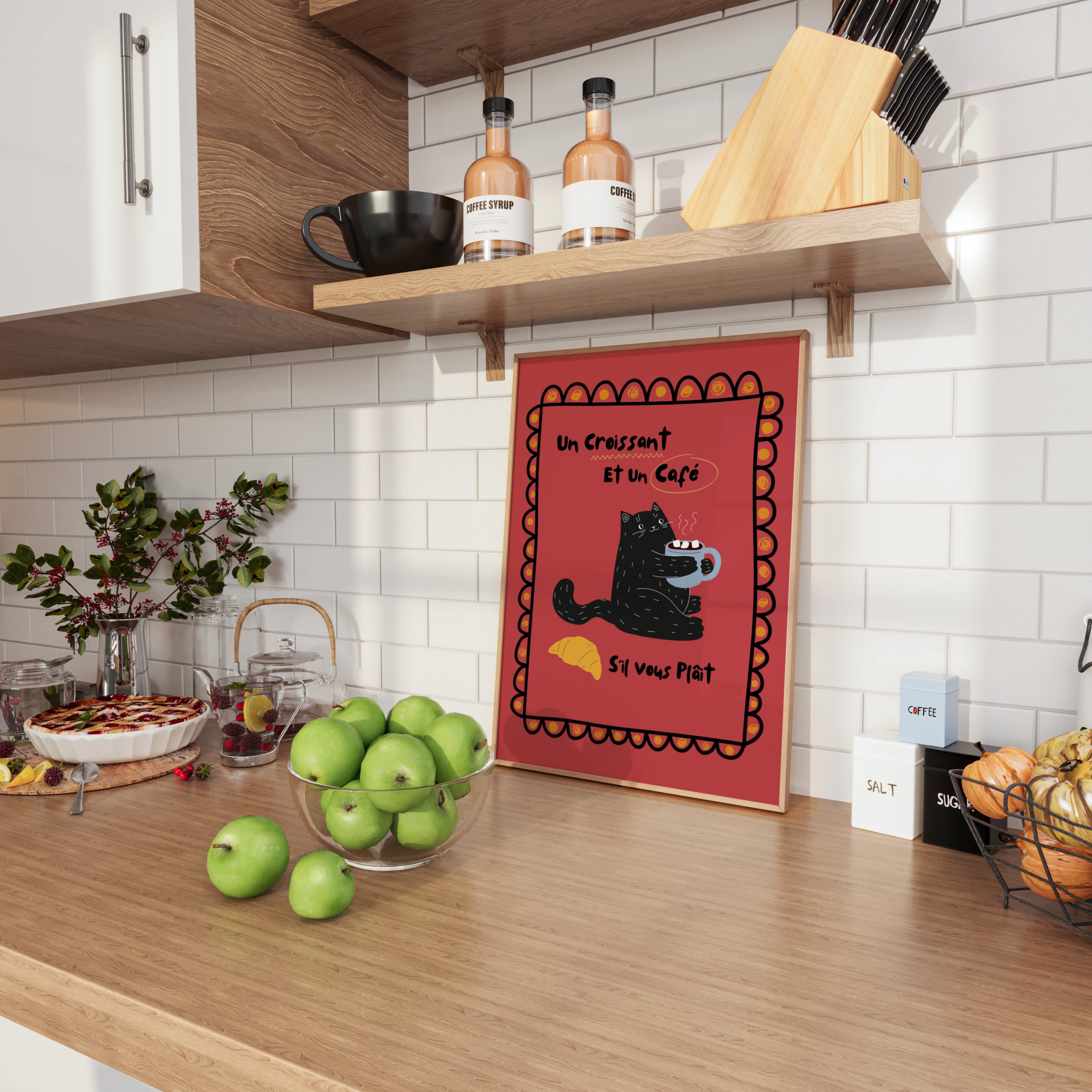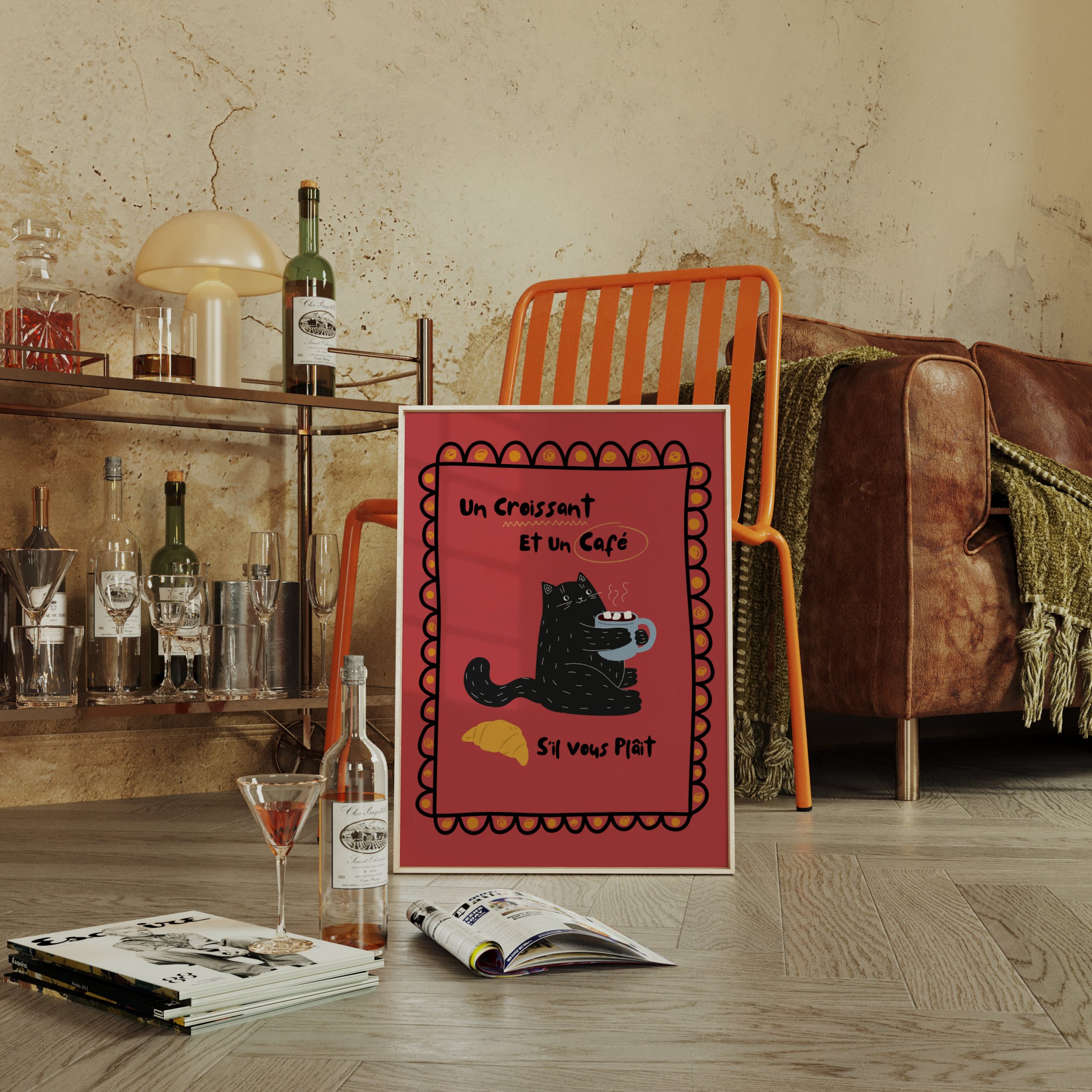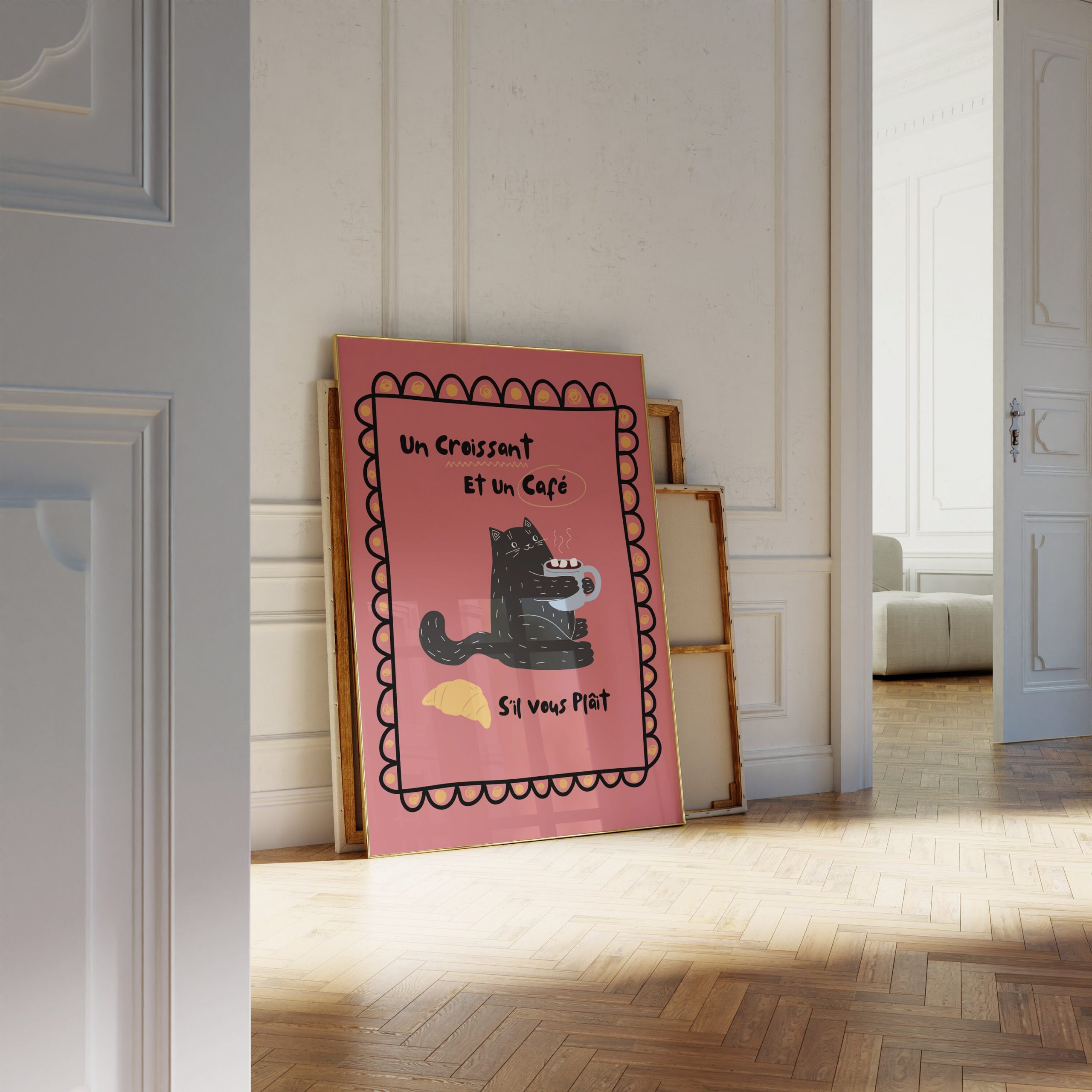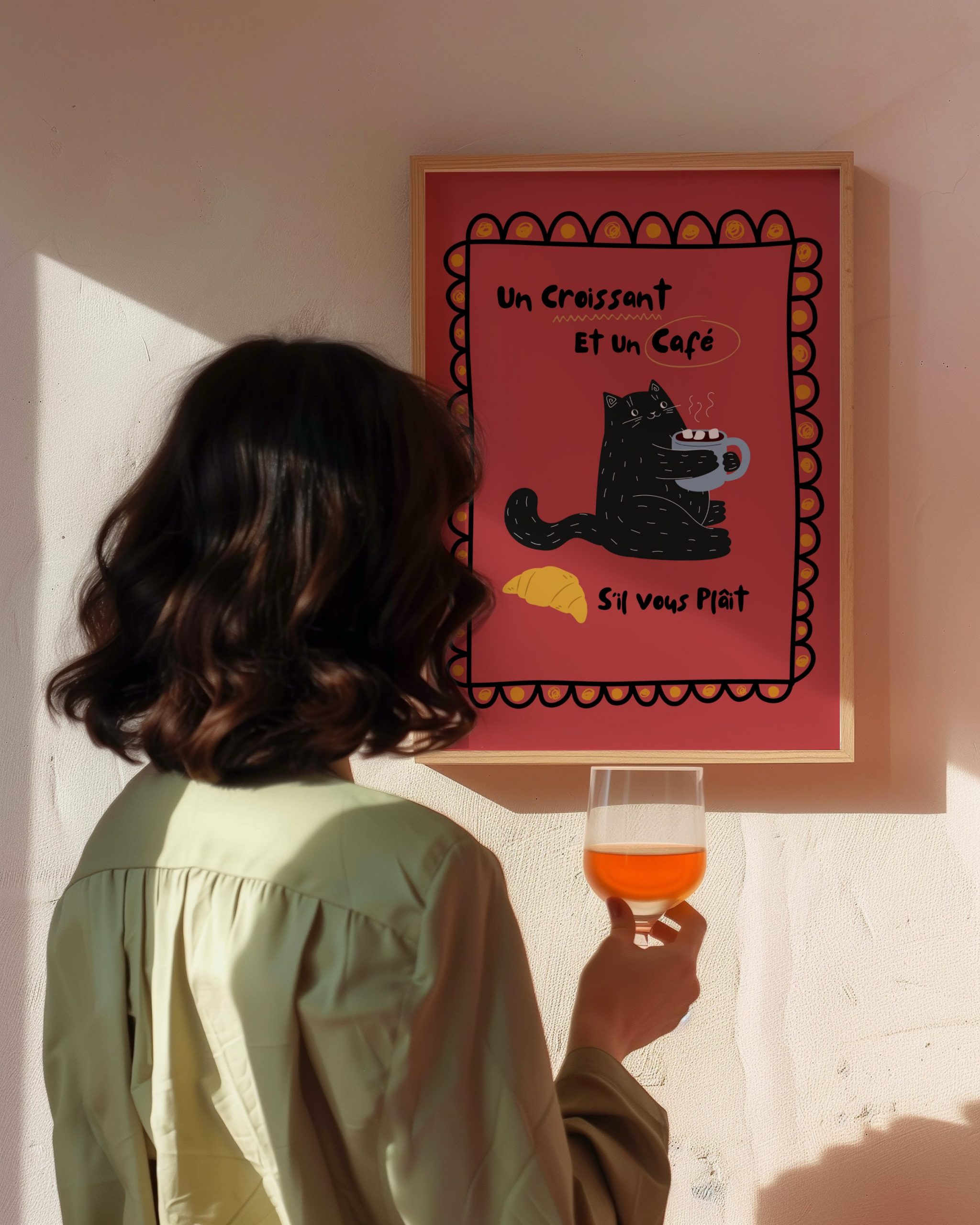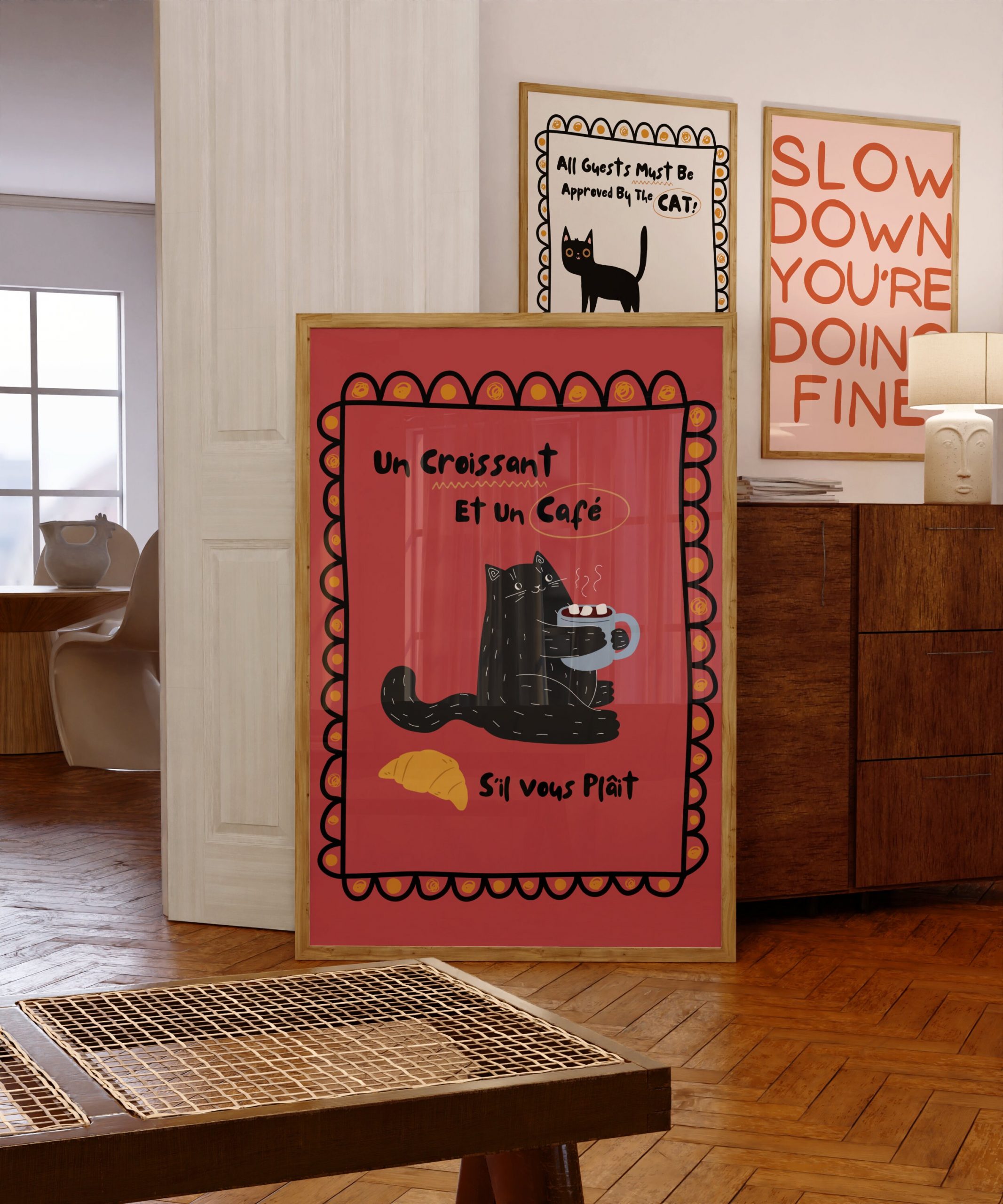 Download, print, and frame Black Cat – Un Croissant et un Cafe – Red | Wall Art:
