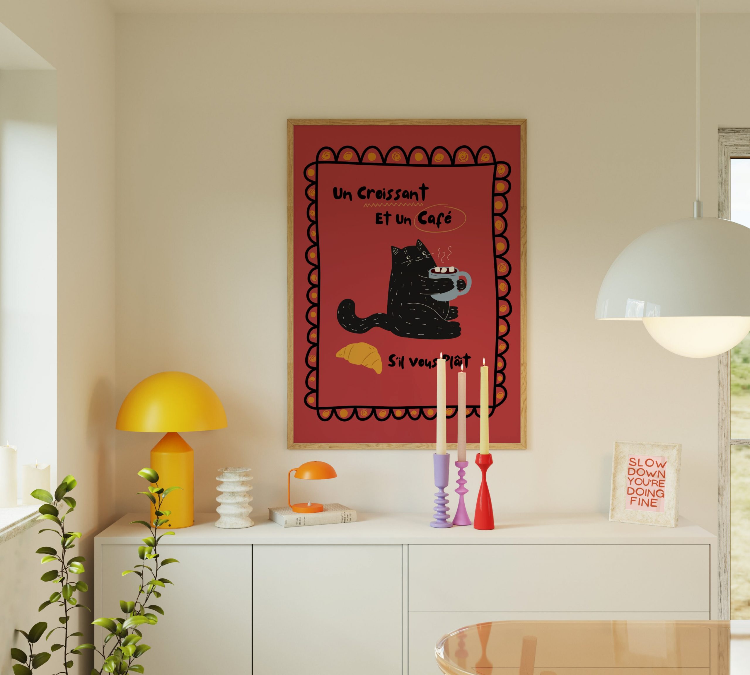 This unique piece of wall art effortlessly combines minimalist aesthetics with a modern, minimalist twist. Perfect addition to any room, especially the kitchen or living room. Whether you’re looking to infuse some personality into your home or create a bold focal point, our Black Cat – Un Croissant et un Cafe – Red is the ideal choice. Explore the world of beautiful, modern, and minimalist wall art and enhance your living space today.