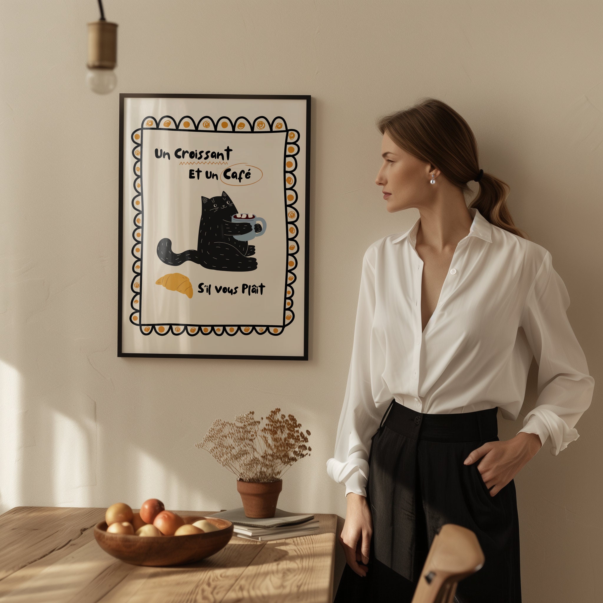 Download, print, and frame Black Cat – Un Croissant et un Cafe – White | Wall Art: