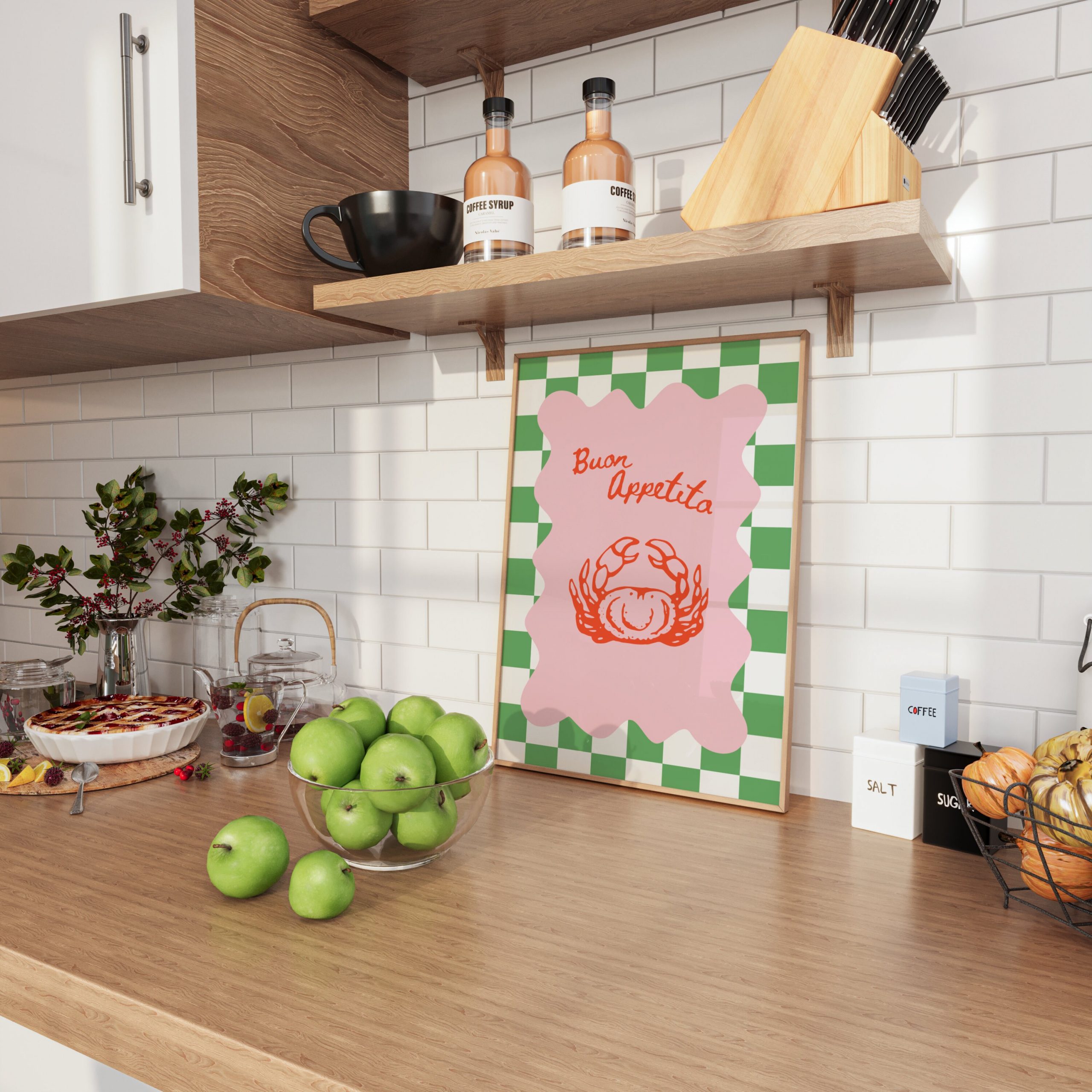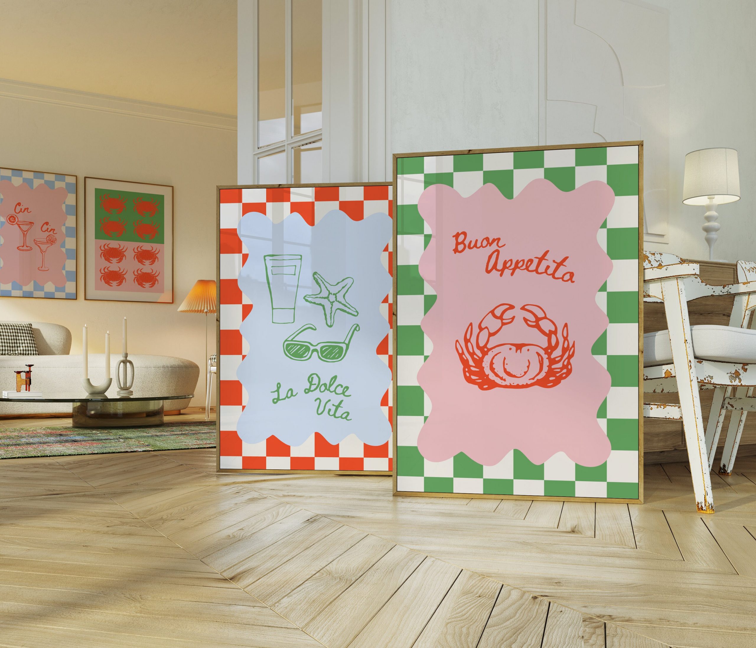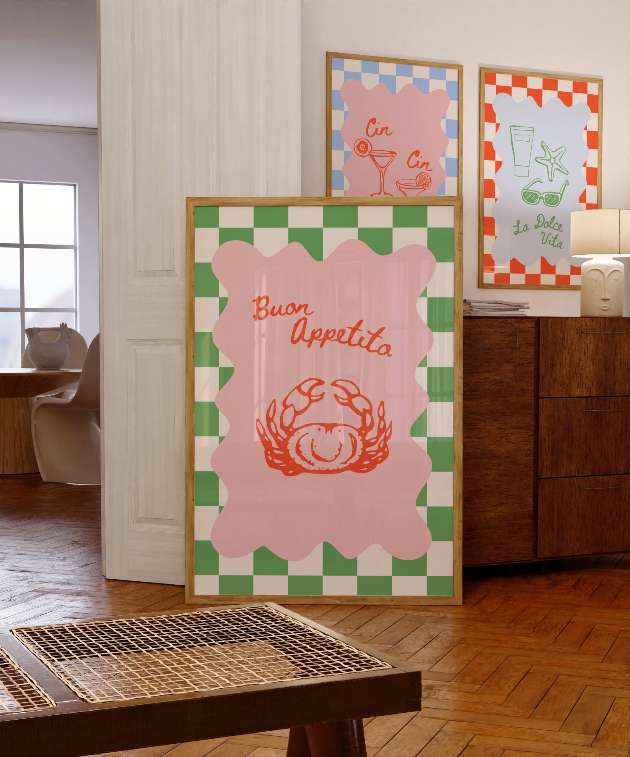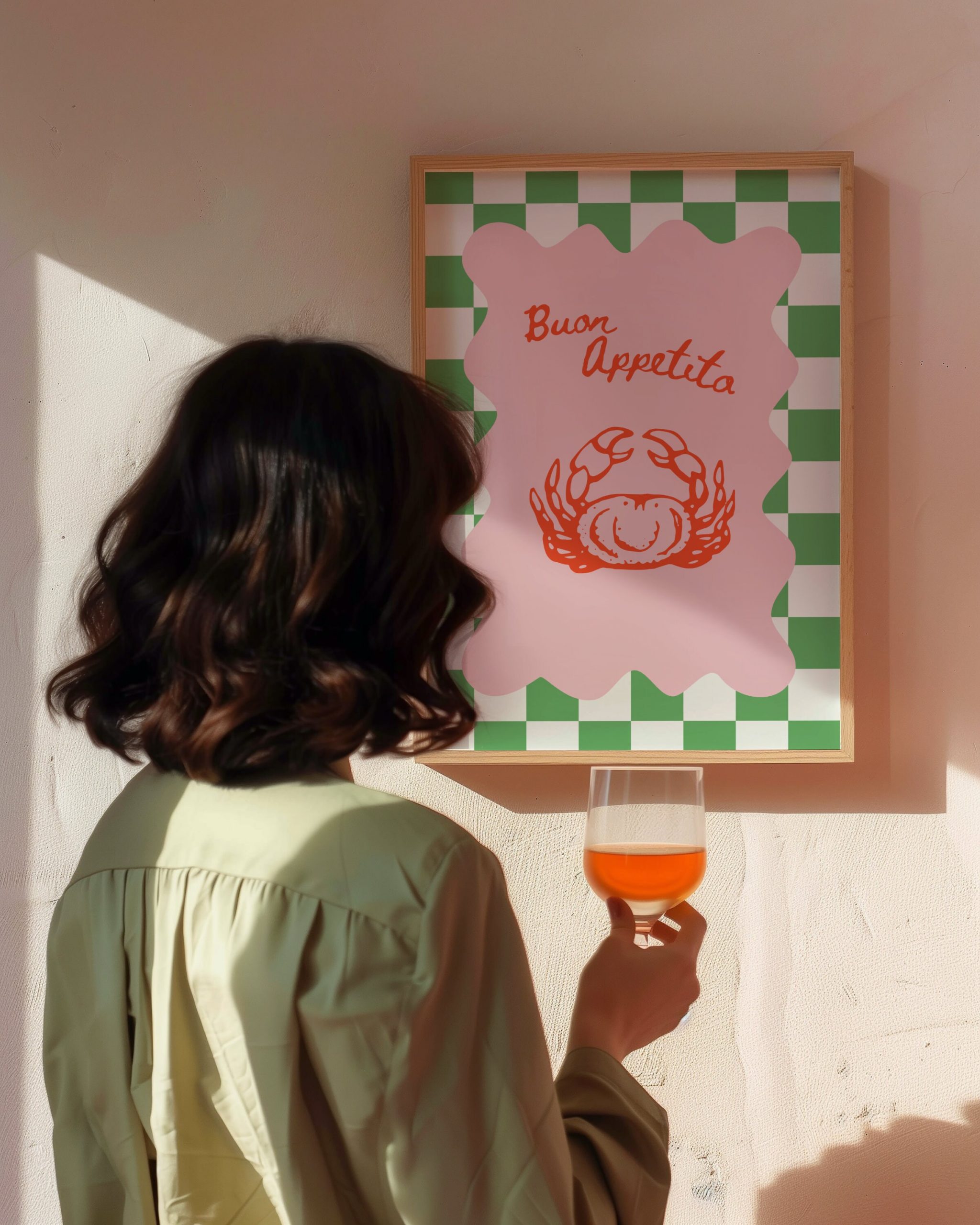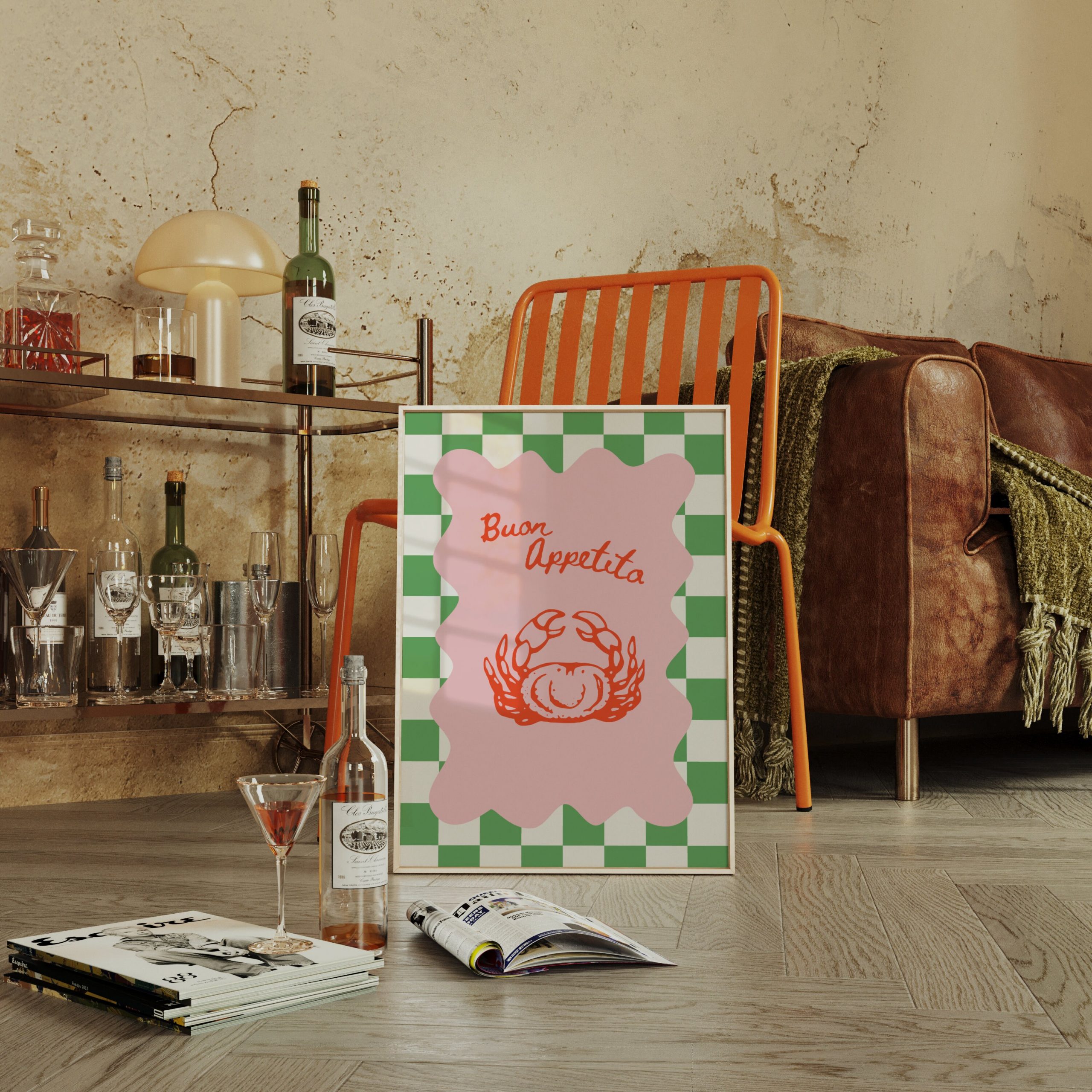 Bring a touch of Italian charm and a burst of dopamine to your kitchen with our Buon Appetito – Chess Green Crab Print | Eclectic Decor Italian Print. This vibrant and lively kitchen print will transport you to the heart of Italy, where fragrant aromas and mouthwatering flavors abound. The maximalism poster features retro-inspired elements and a preppy print, adding a unique and stylish touch to your restaurant decor. Hang it proudly on your wall and let the bold colors and whimsical design inspire culinary adventures. Crafted with attention to detail, this poster is a must-have for any foodie or lover of eclectic decor.