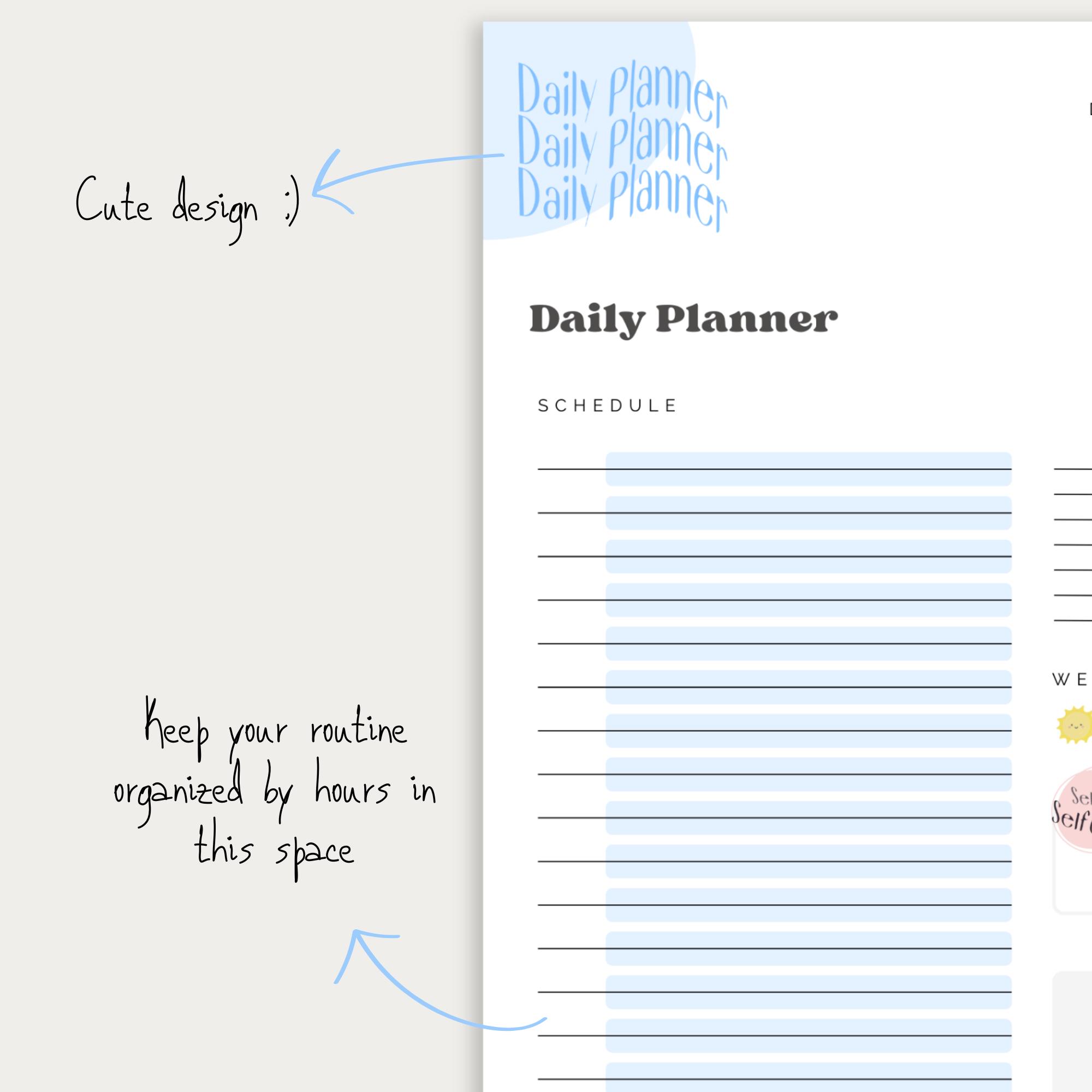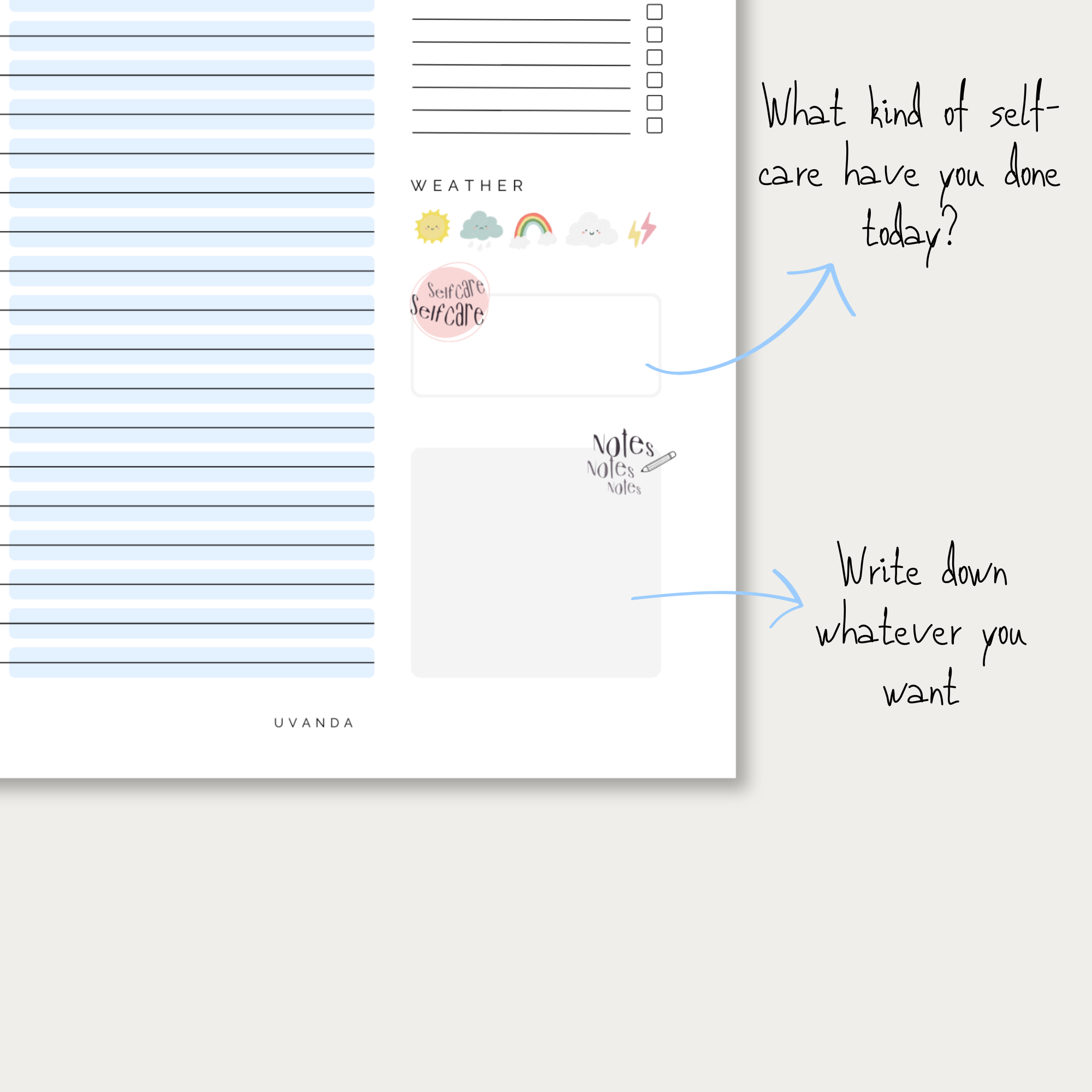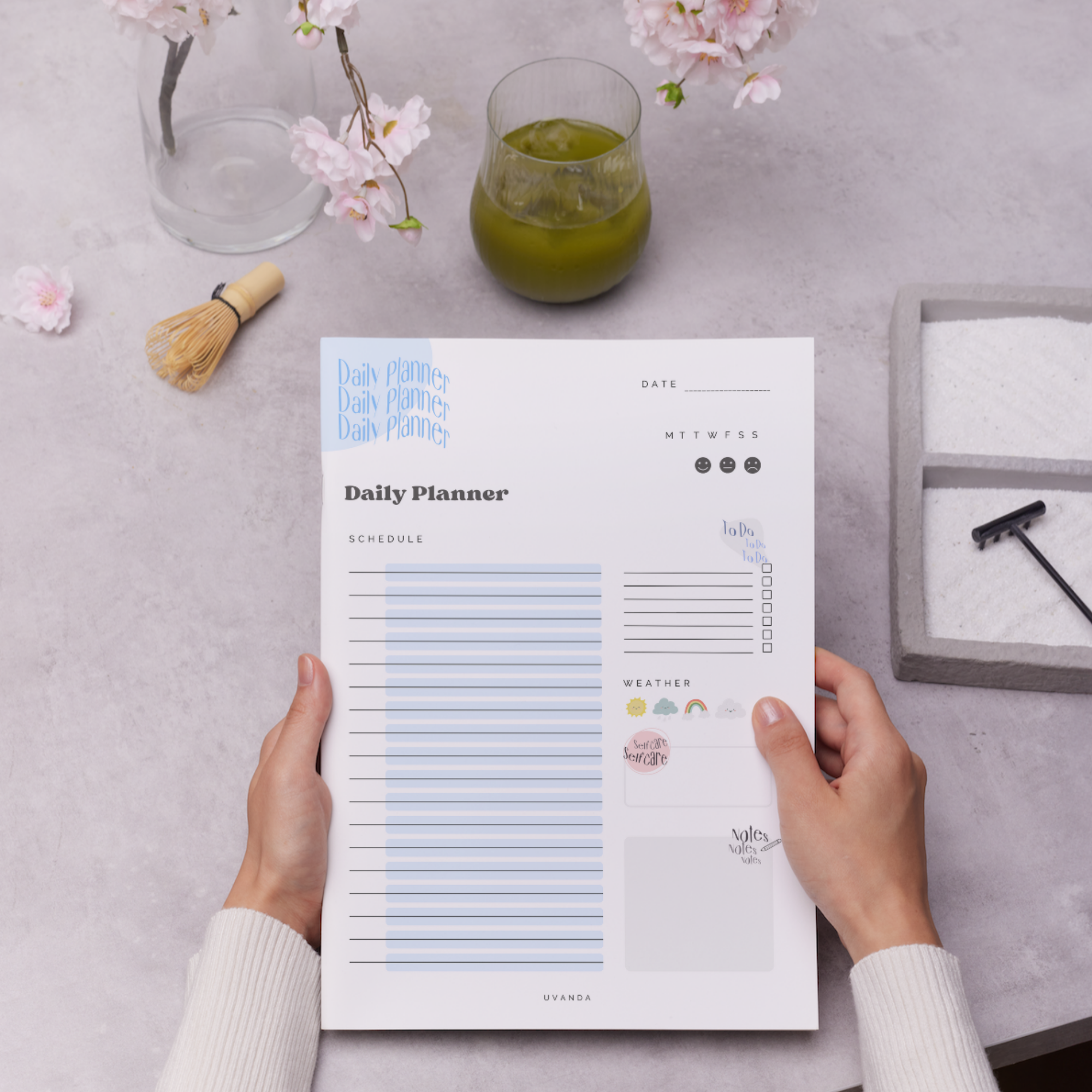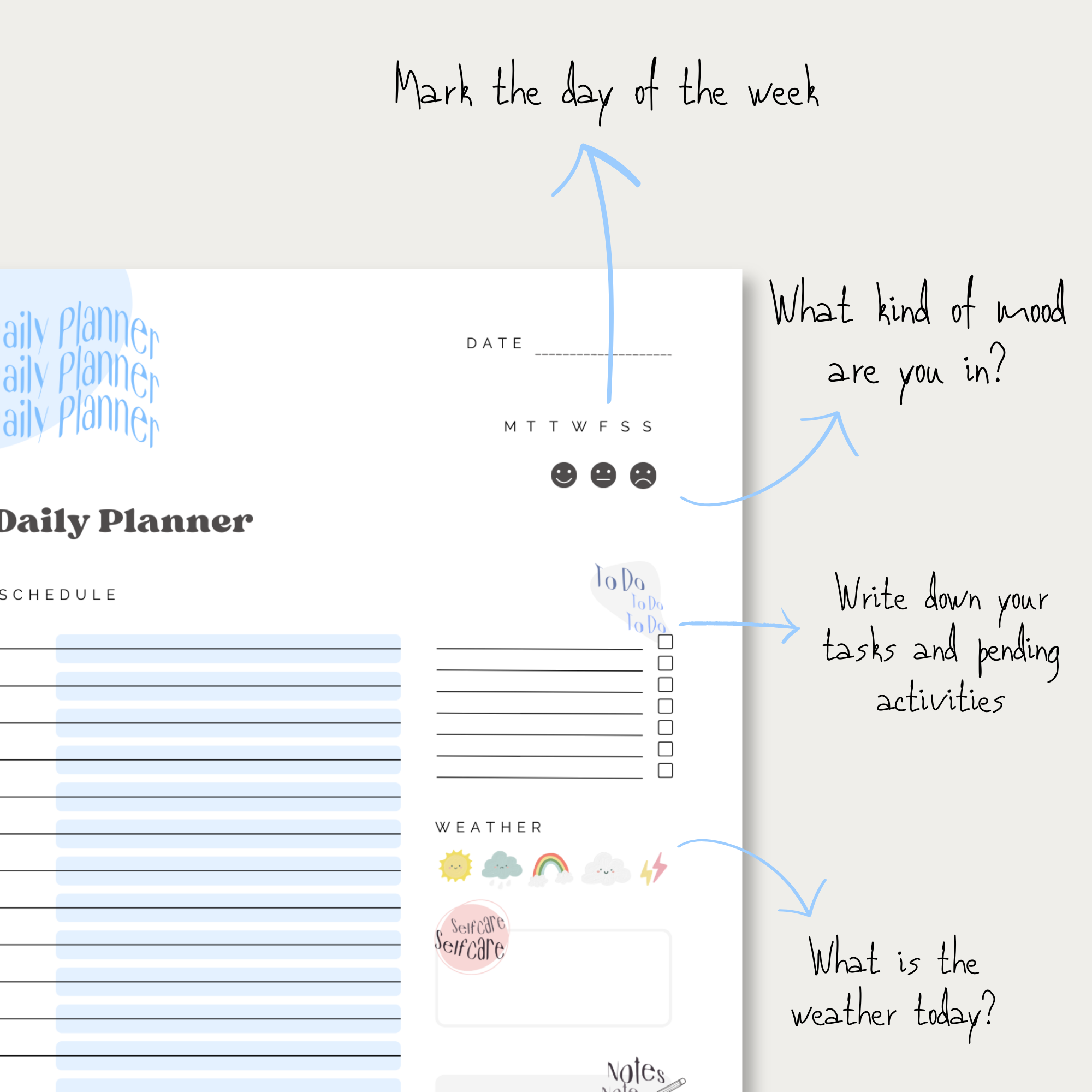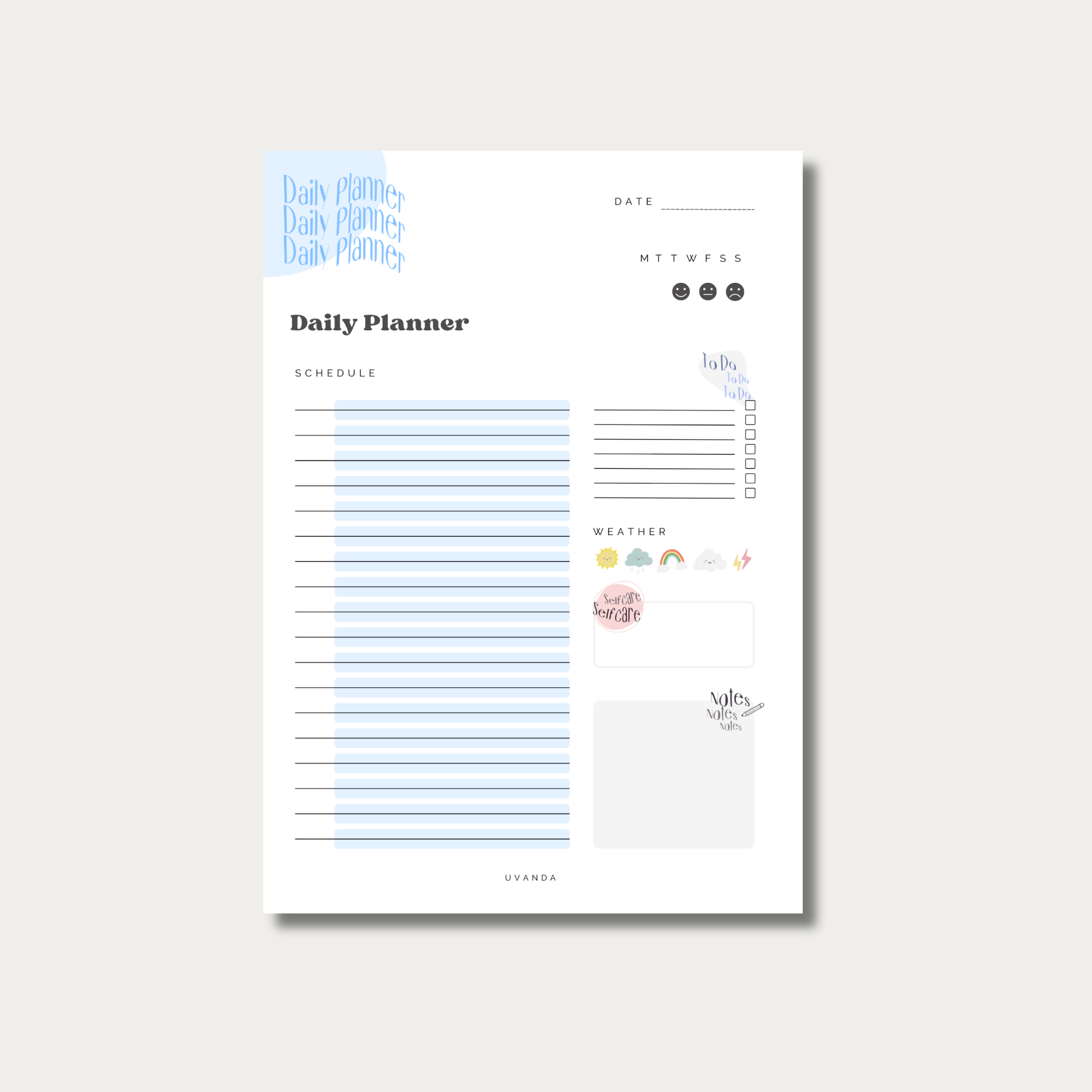 The daily planner includes several sections to help you stay organized and on top of your schedule. It features an agenda to write down events in the notes section, a to-do list, a self-care section, and a section to write down what the weather was today. This allows you to have a clear overview of your tasks and activities for the day, and help you to prioritize what is most important.