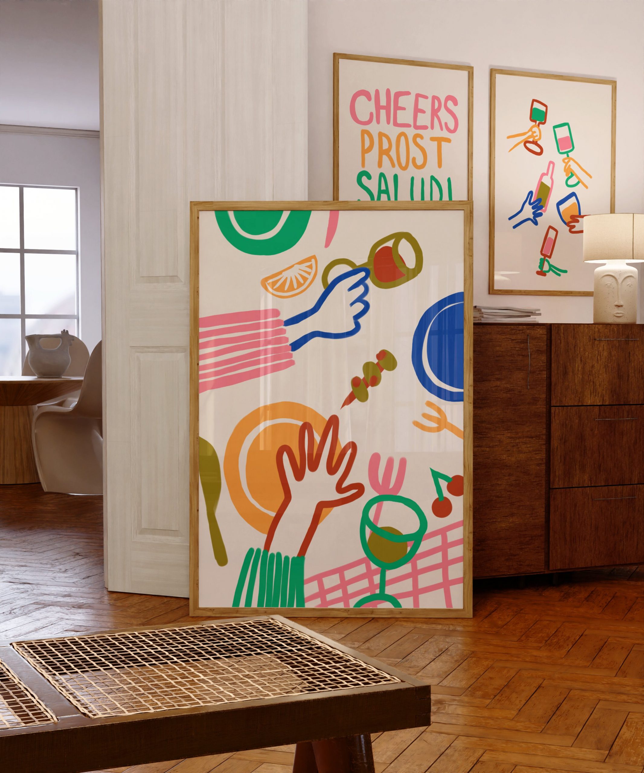 Set of 2 – Hand Drawn Dinner Print Cin Cin Wall Art Drink Poster Cocktail Living Room Apartment Quirky Decor Let’s Eat Restaurant Bar