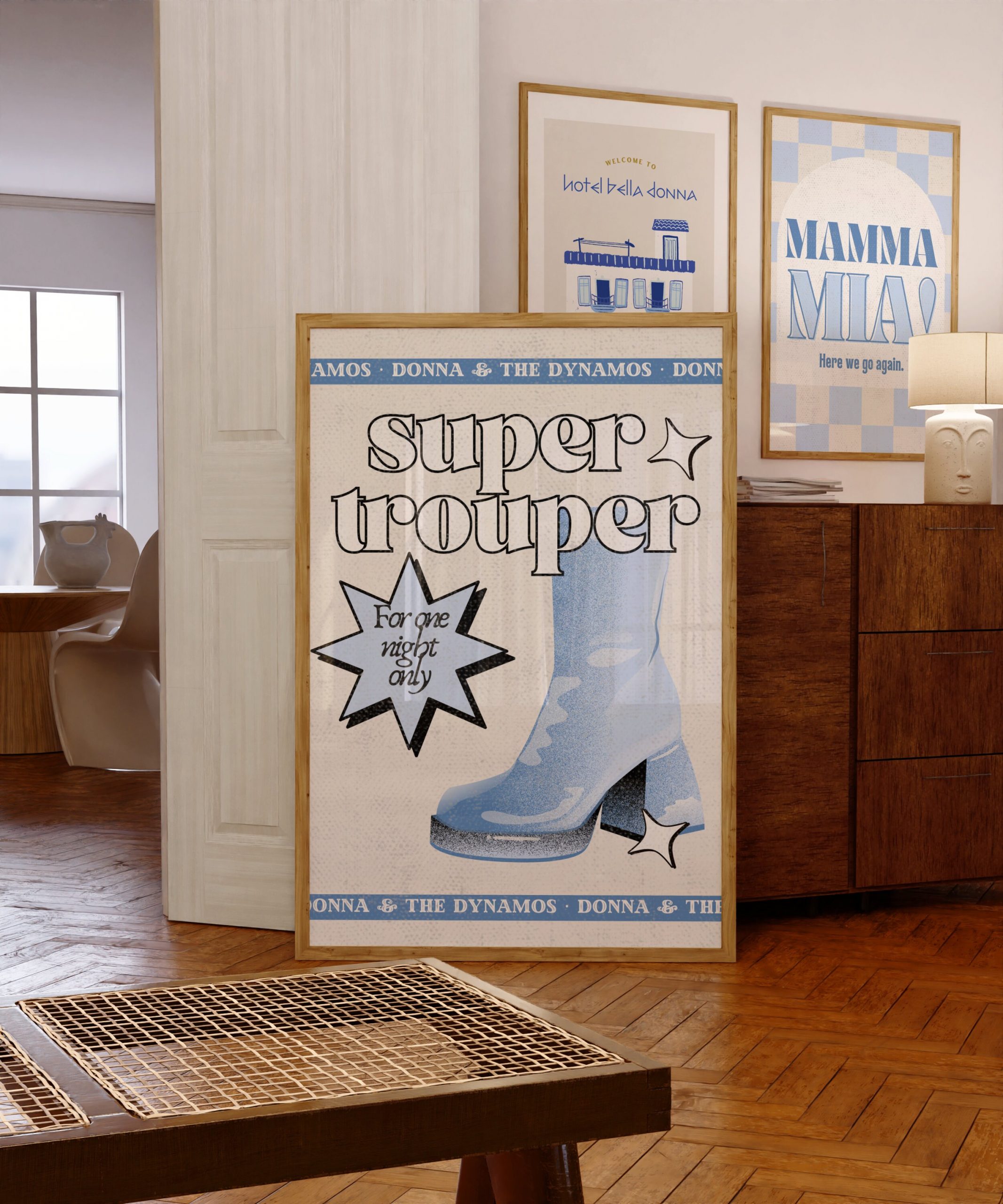 Set of 2 – Mamma Mia 70s Blue Donna and The Dynamos Print, Greek Islands Music Band Dancing Queen Printable Greece Wall Art Skopelos Blue Super Trouper