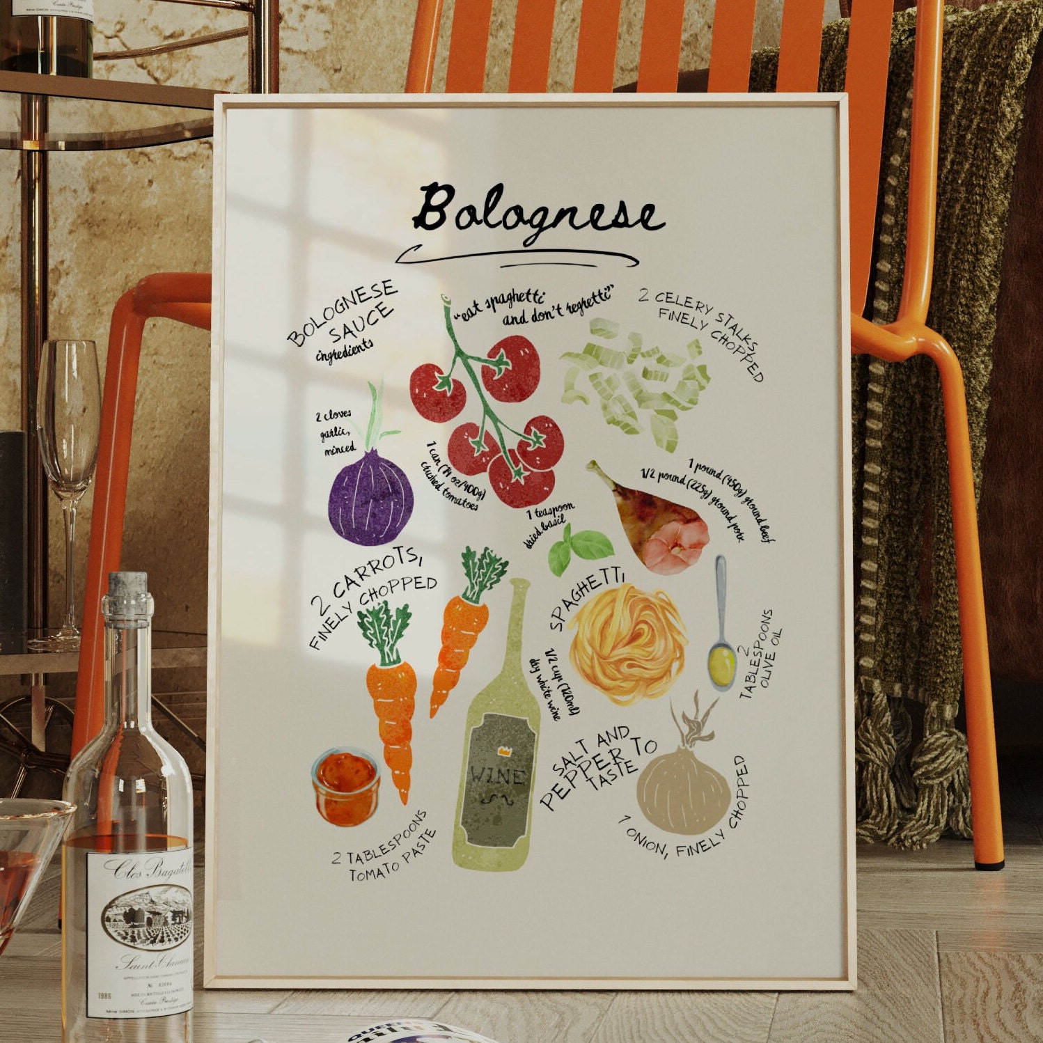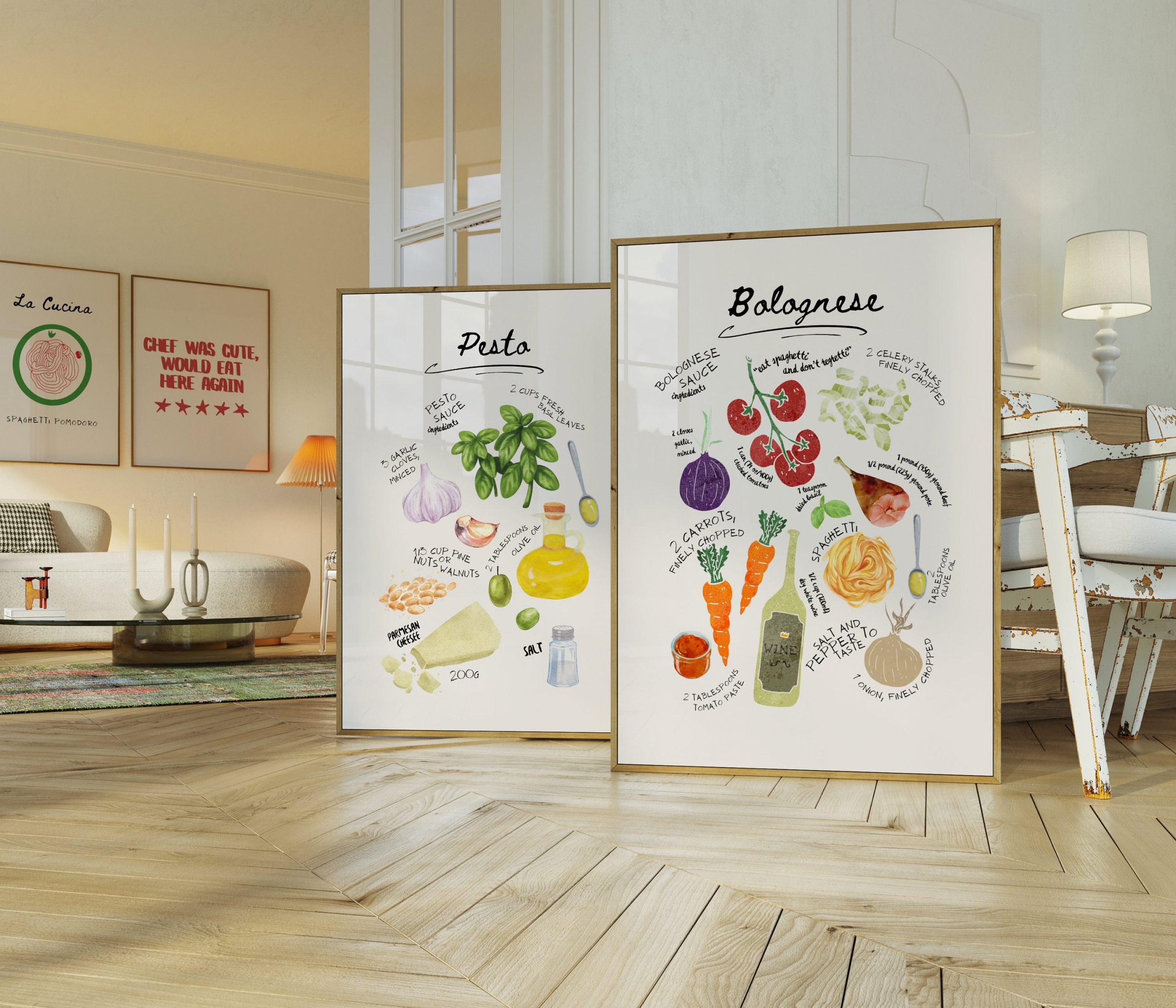 Set of 2 – Pesto Bolognese Recipe Food Poster Italian Restaurant Menu Parmesan Ingredients Pasta Lover Club Bar Italy Wall Art Set