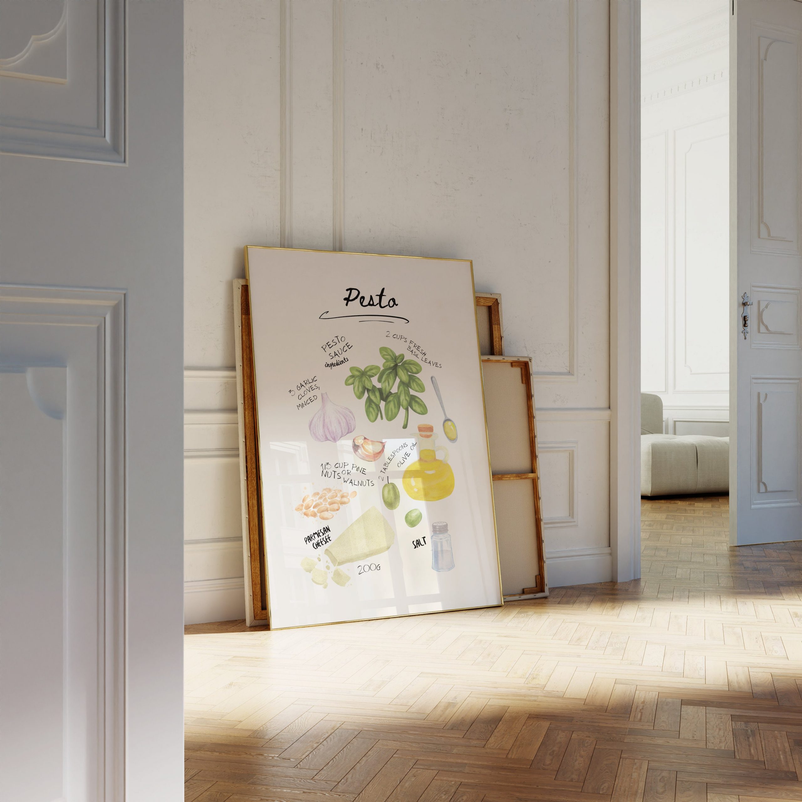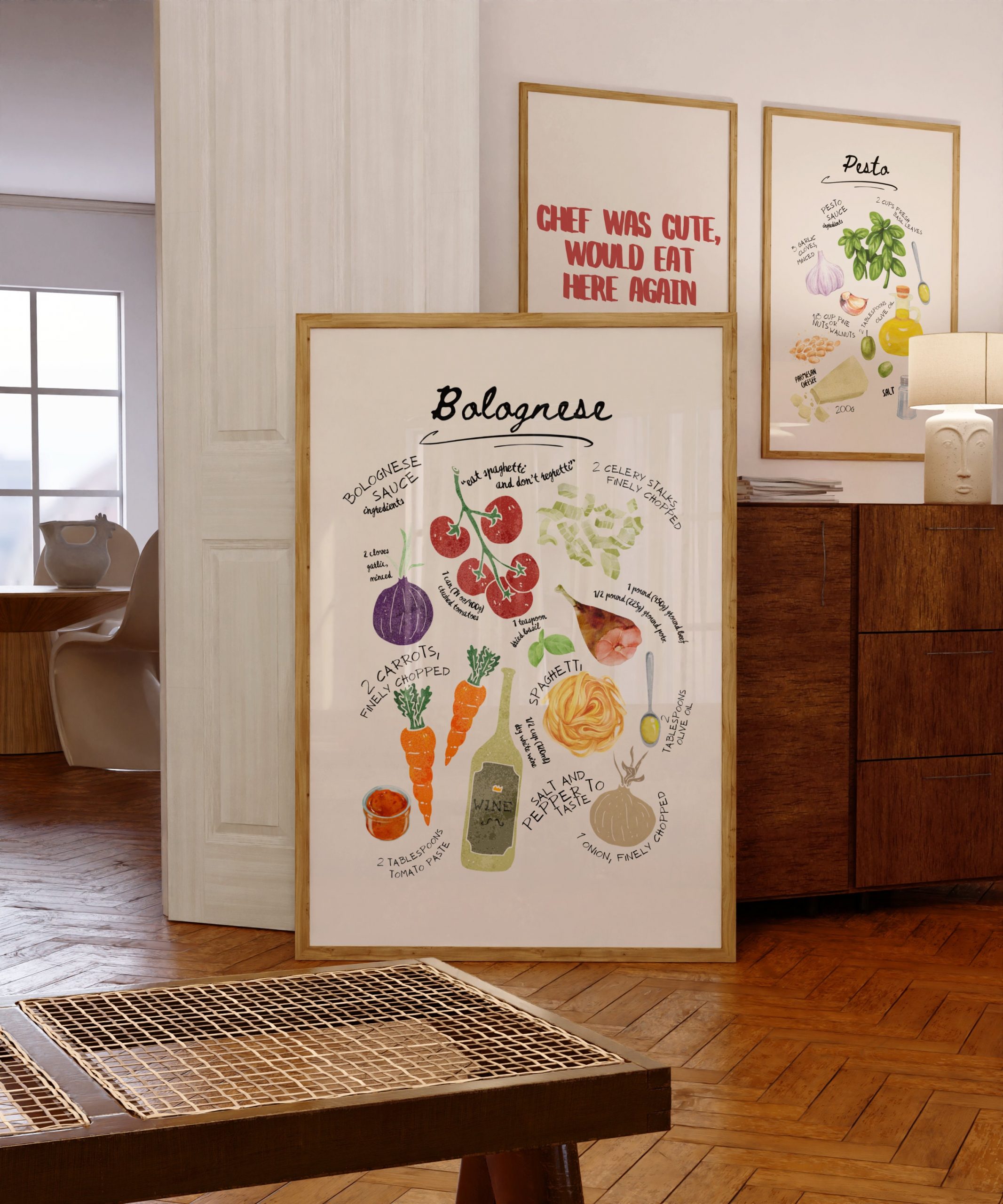 Download, print, and frame Set of 2 – Pesto Bolognese Recipe and colorful painting.