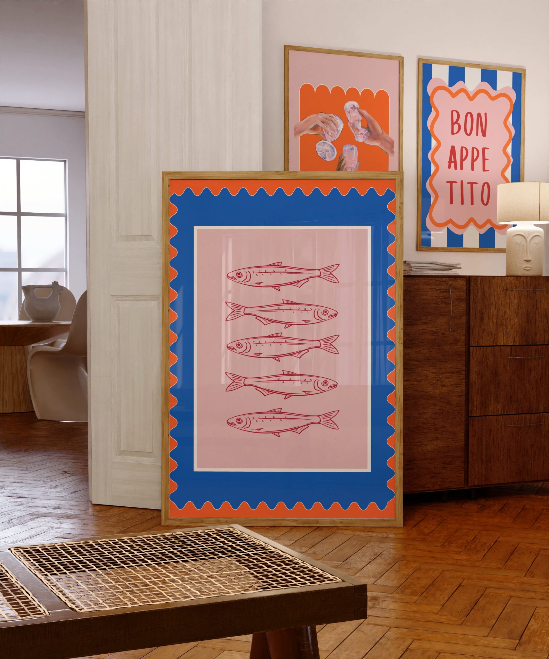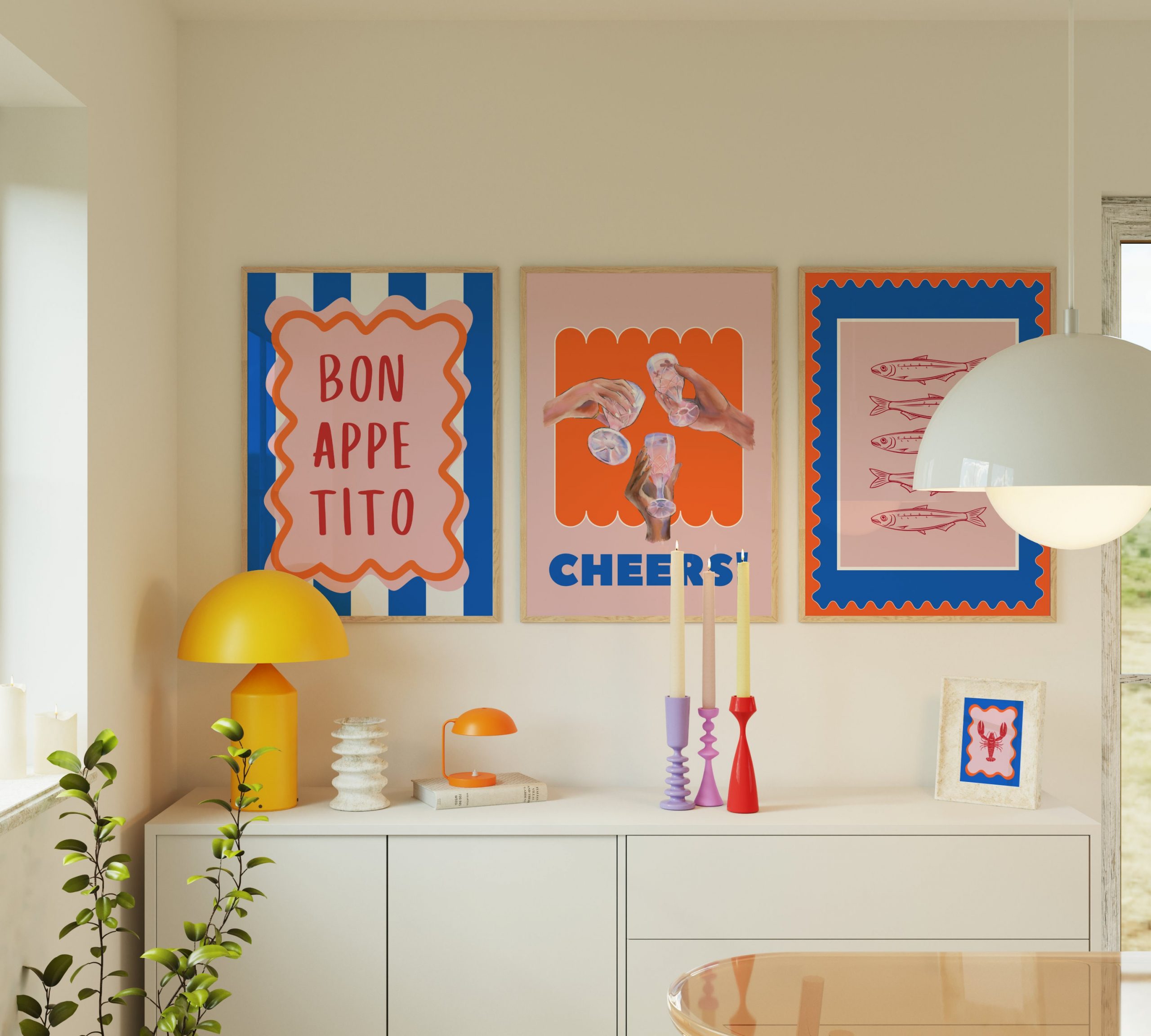Set of 3 – Bon Appetit Cheers Print Print, Cin Cin Bar Retro Maximalism Eclectic Dopamine Decor Kitchen Poster Seafood Restaurant Fish Sea Wall Art