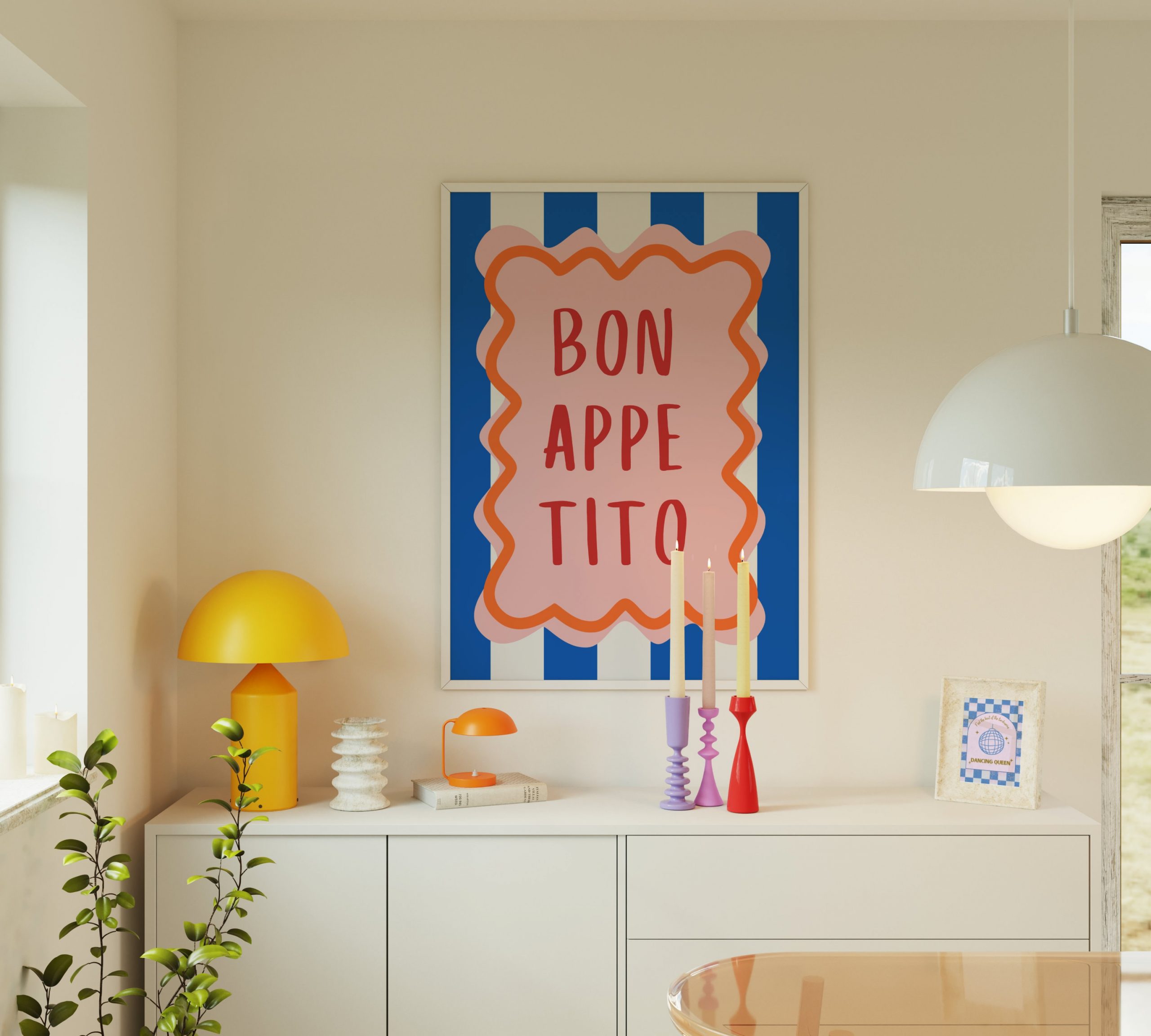 Bring a touch of Italian charm and a burst of dopamine to your kitchen with our Set of 3 – Bon Appetit Cheers Print | Eclectic Decor Italian Print. This vibrant and lively kitchen print will transport you to the heart of Italy, where fragrant aromas and mouthwatering flavors abound. The maximalism poster features retro-inspired elements and a preppy print, adding a unique and stylish touch to your restaurant decor. Hang it proudly on your wall and let the bold colors and whimsical design inspire culinary adventures. Crafted with attention to detail, this poster is a must-have for any foodie or lover of eclectic decor.