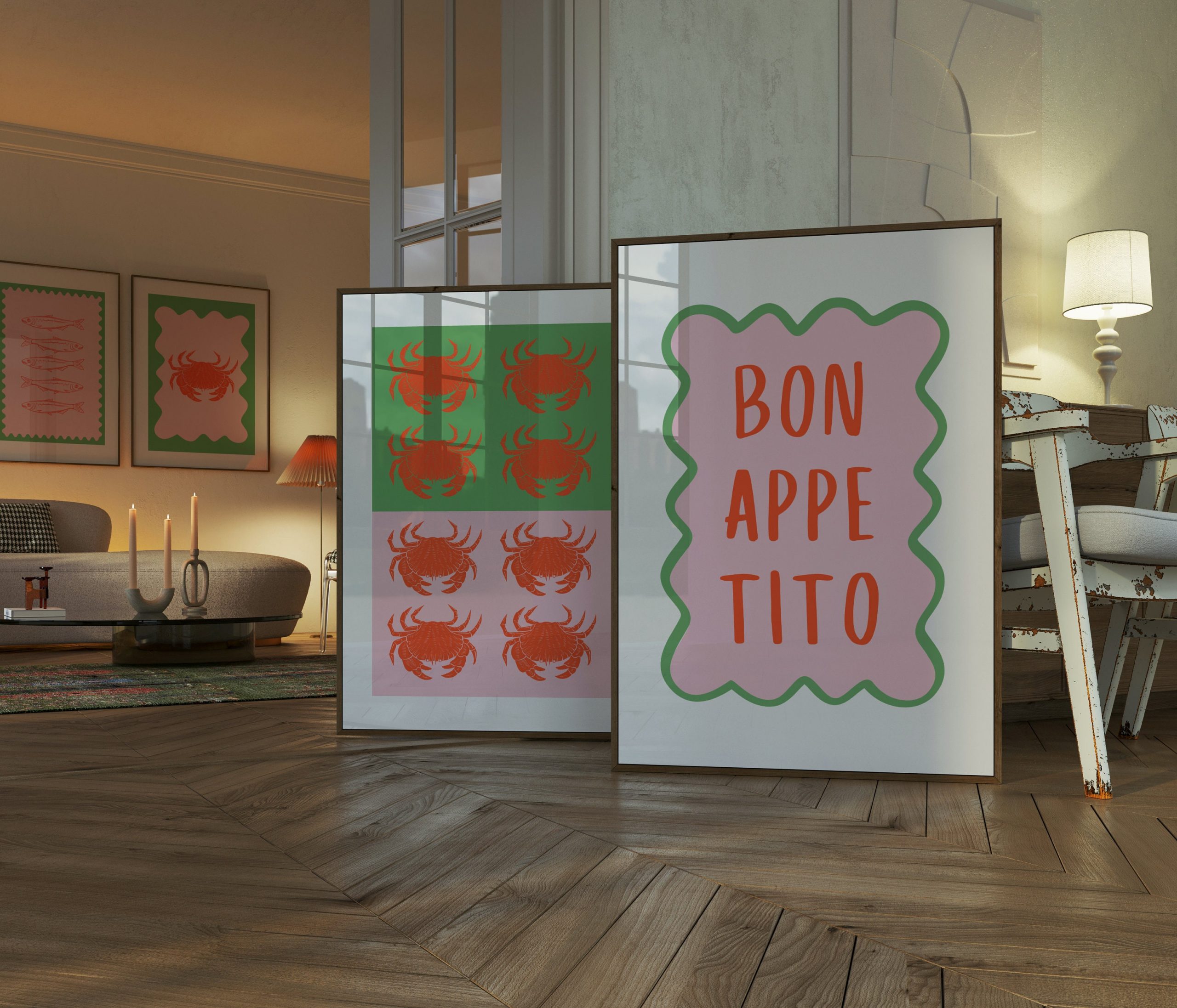 Bring a touch of Italian charm and a burst of dopamine to your kitchen with our Set of 3 – Bon Appetit Seafood Print. This vibrant and lively kitchen print will transport you to the heart of Italy, where fragrant aromas and mouthwatering flavors abound. The maximalism poster features retro-inspired elements and a preppy print, adding a unique and stylish touch to your restaurant decor. Hang it proudly on your wall and let the bold colors and whimsical design inspire culinary adventures. Crafted with attention to detail, this poster is a must-have for any foodie or lover of eclectic decor.