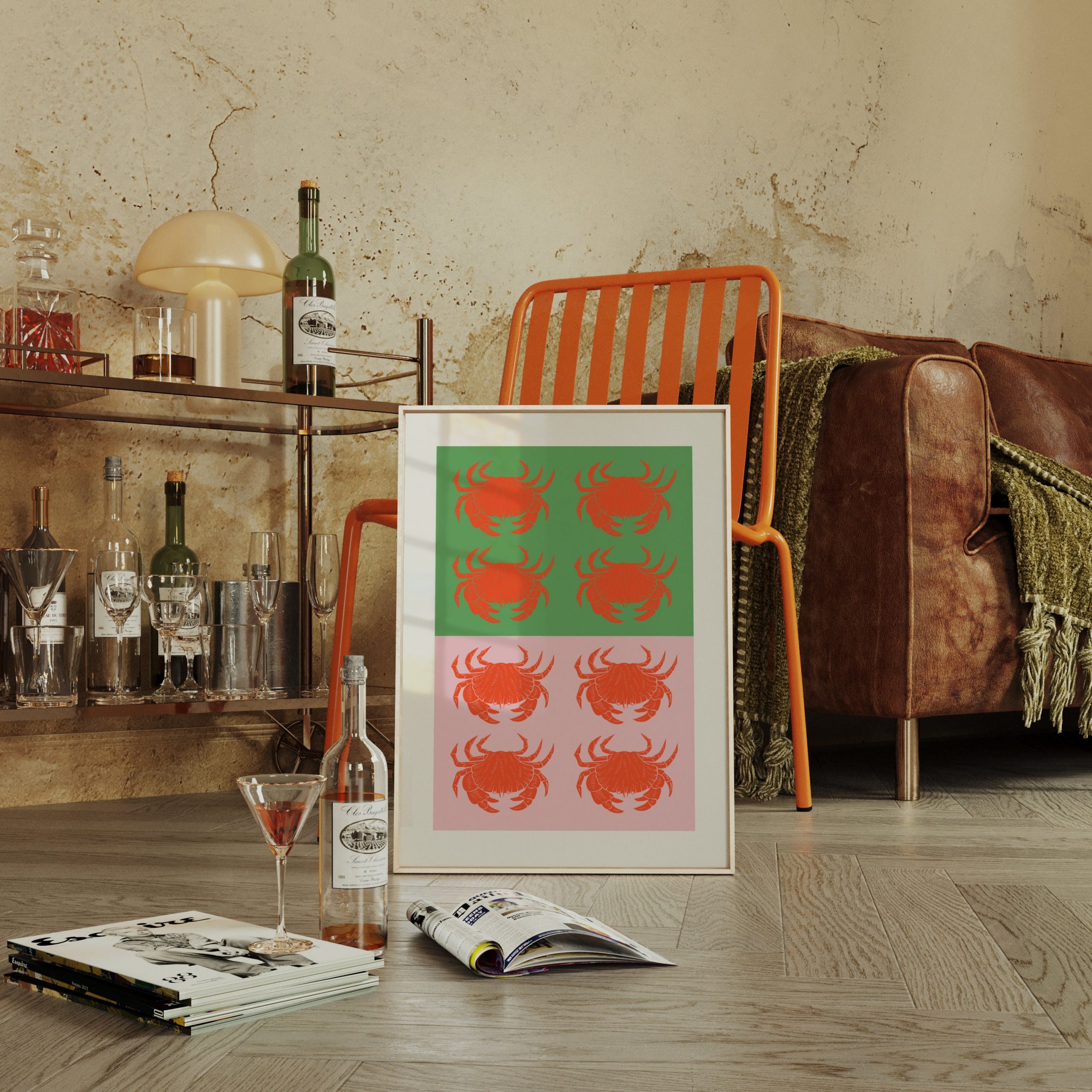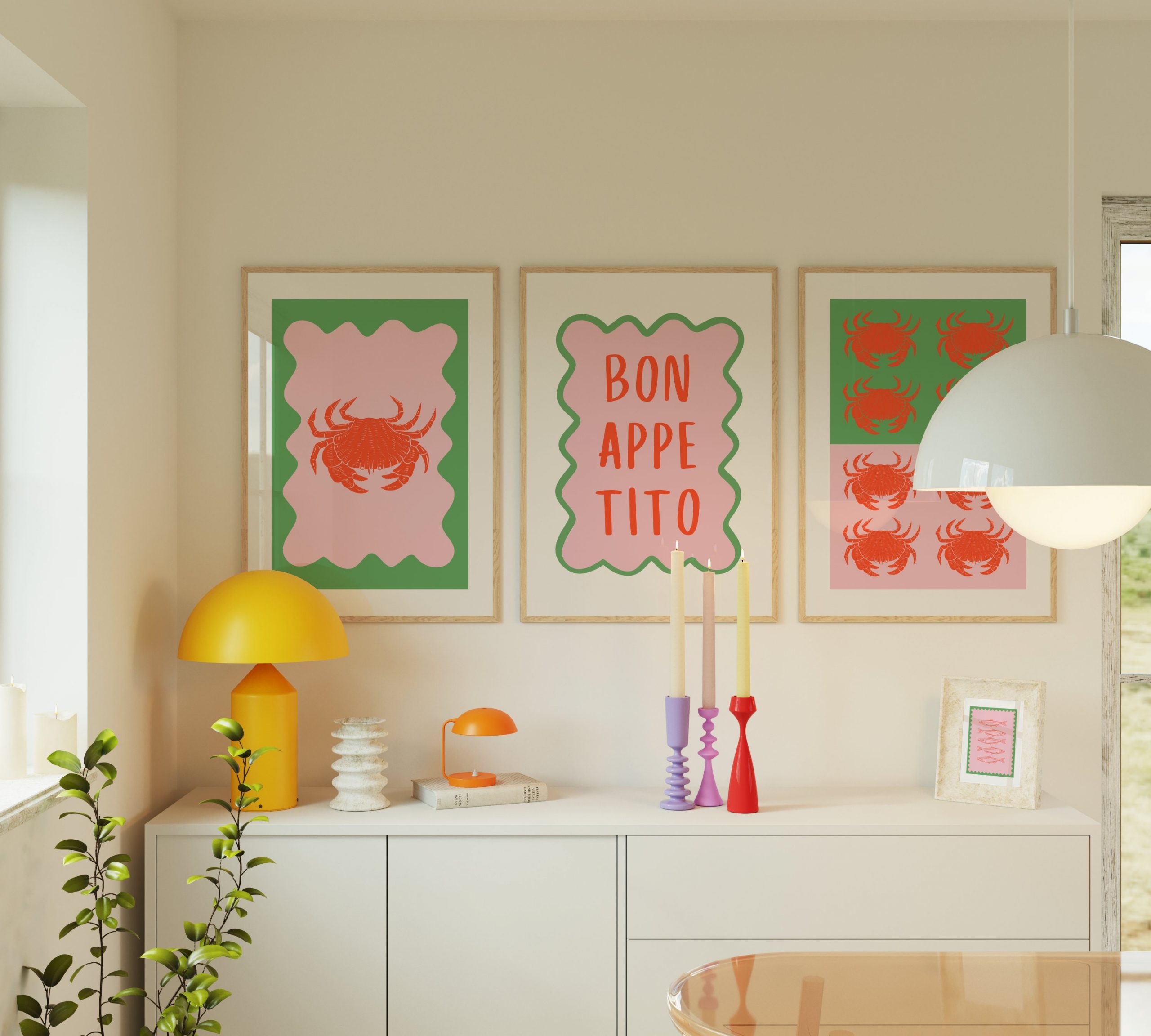 Set of 3 – Bon Appetit Seafood Print, Crab Bar Retro Maximalism Eclectic Dopamine Decor Kitchen Poster Crabfish Restaurant Fish Sea Wall Art